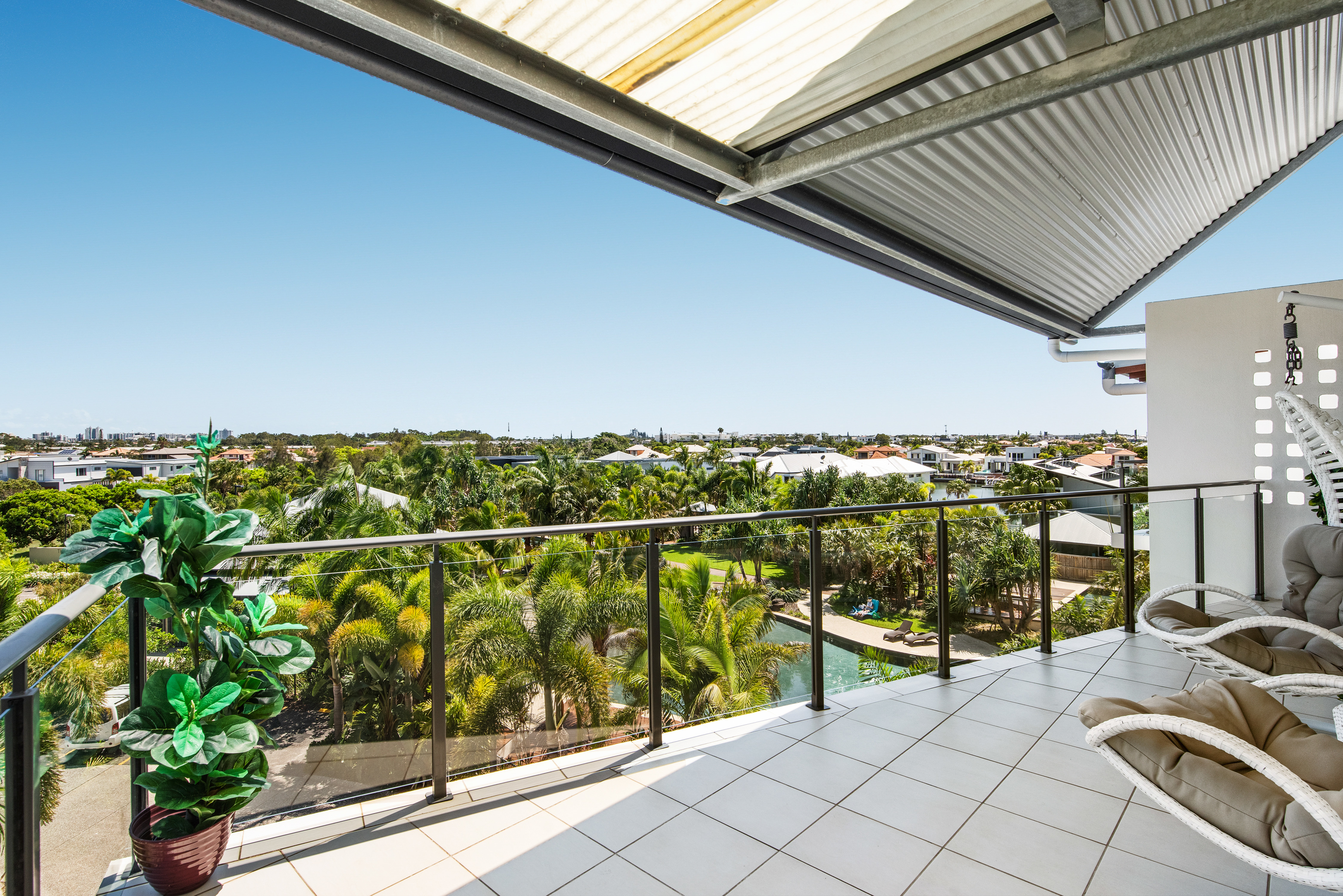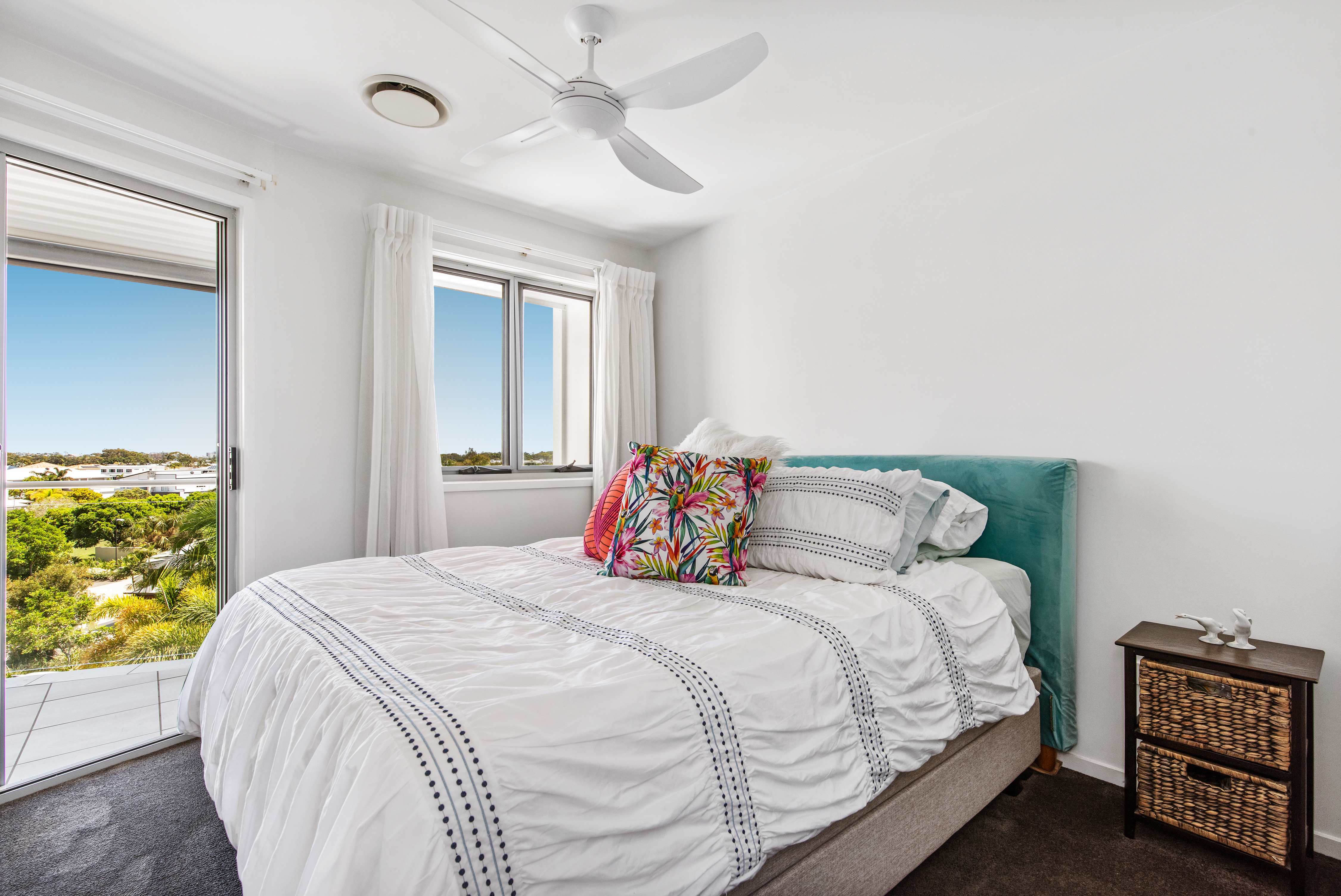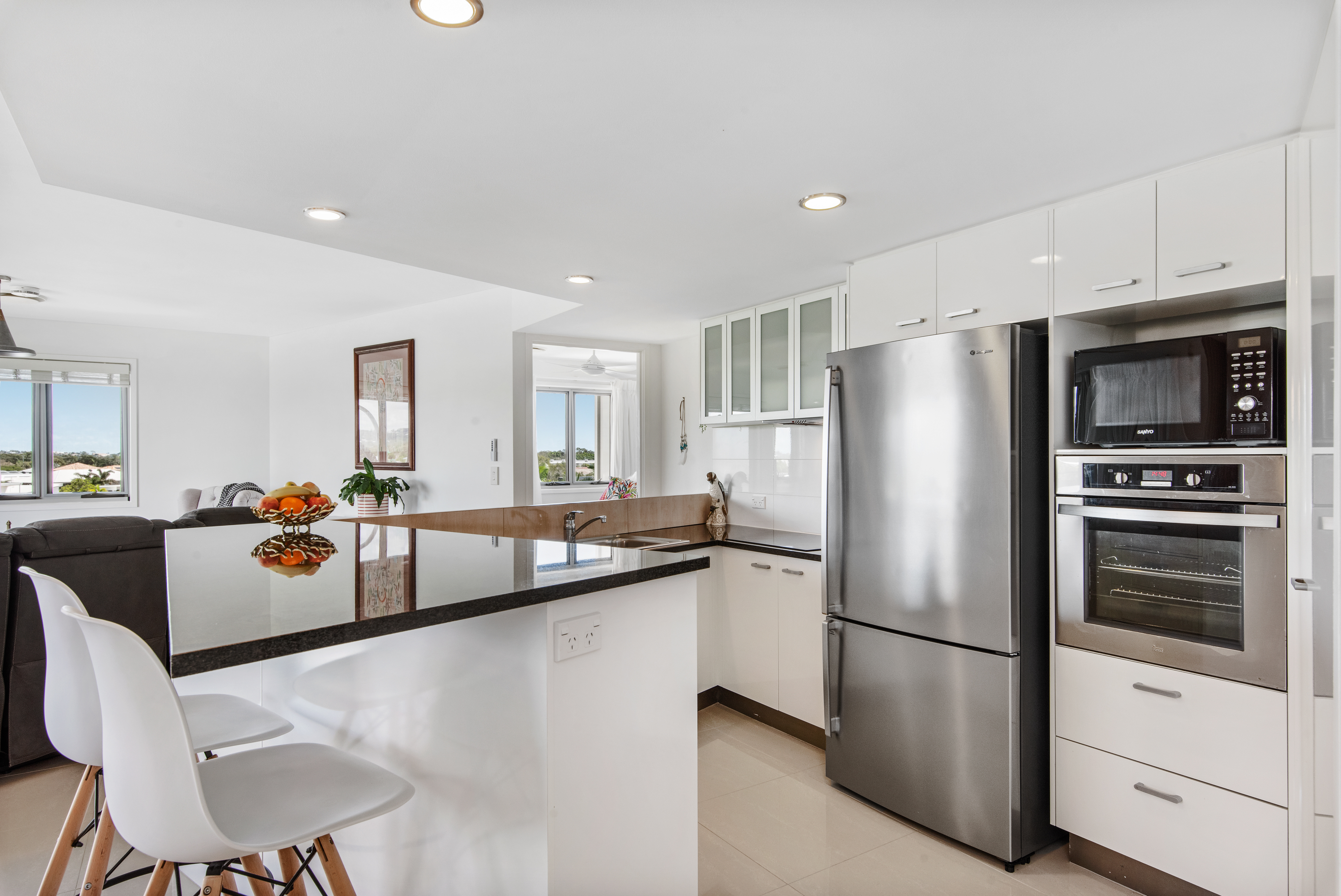 With the large corner balcony and high pitched roof making it even more spacious you will marvel at the wonderful views over the tropical lagoon pool to Parrearra Lake and through to the high rises along Mooloolaba Esplanade.  You also look over to the hills to Buderim in the west, there's a lovely tree filled leafy outlook to the South and then towards Buddina in the east you can see the Shopping Centre and Point Cartwright in the distance.  The proud owners of this immaculate apartment have to move south due to work and family commitments and will be sorry to go as they tell me they will miss their gorgeous views as at night when all the lights are twinkling in the distance it is just so pretty and peaceful!
