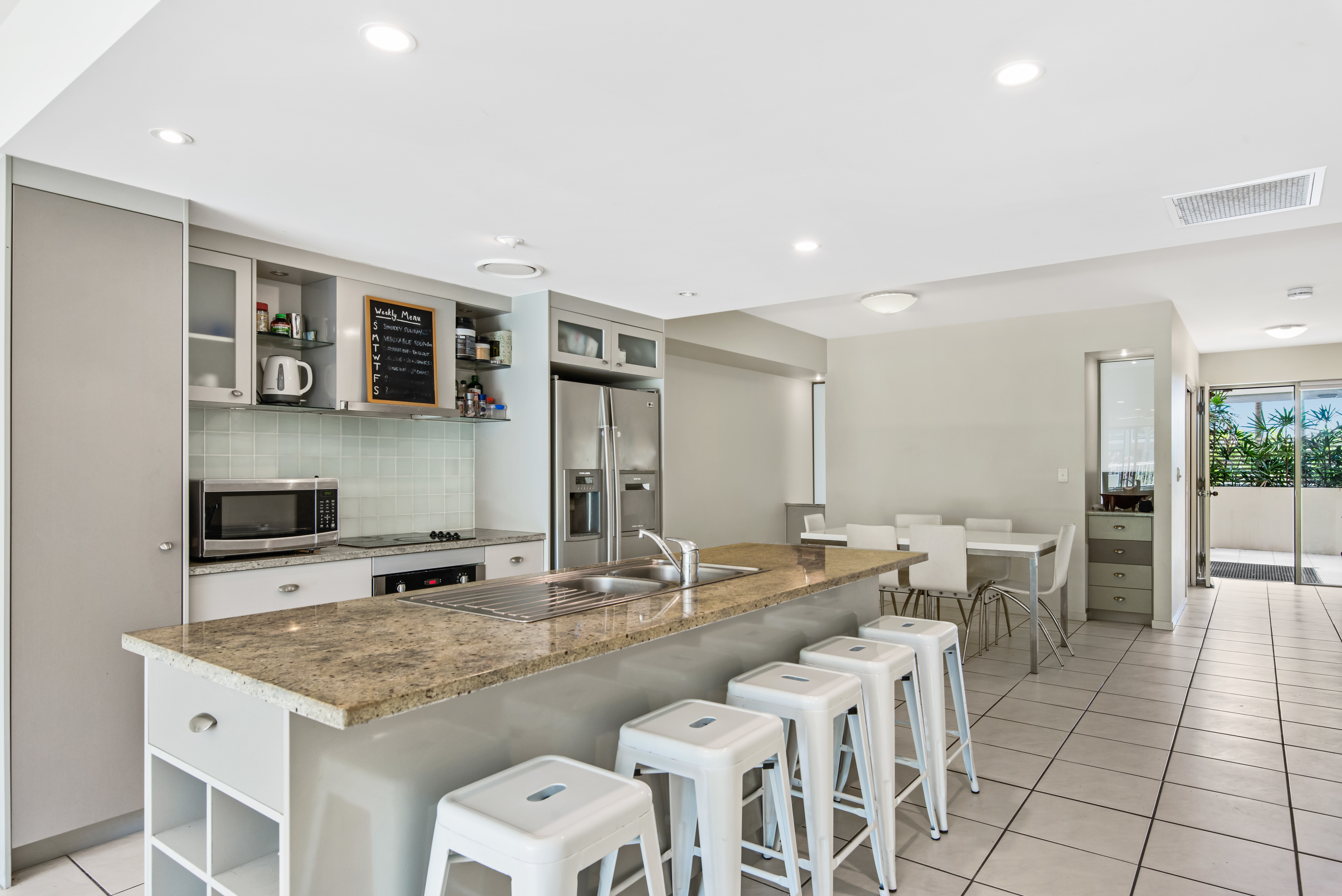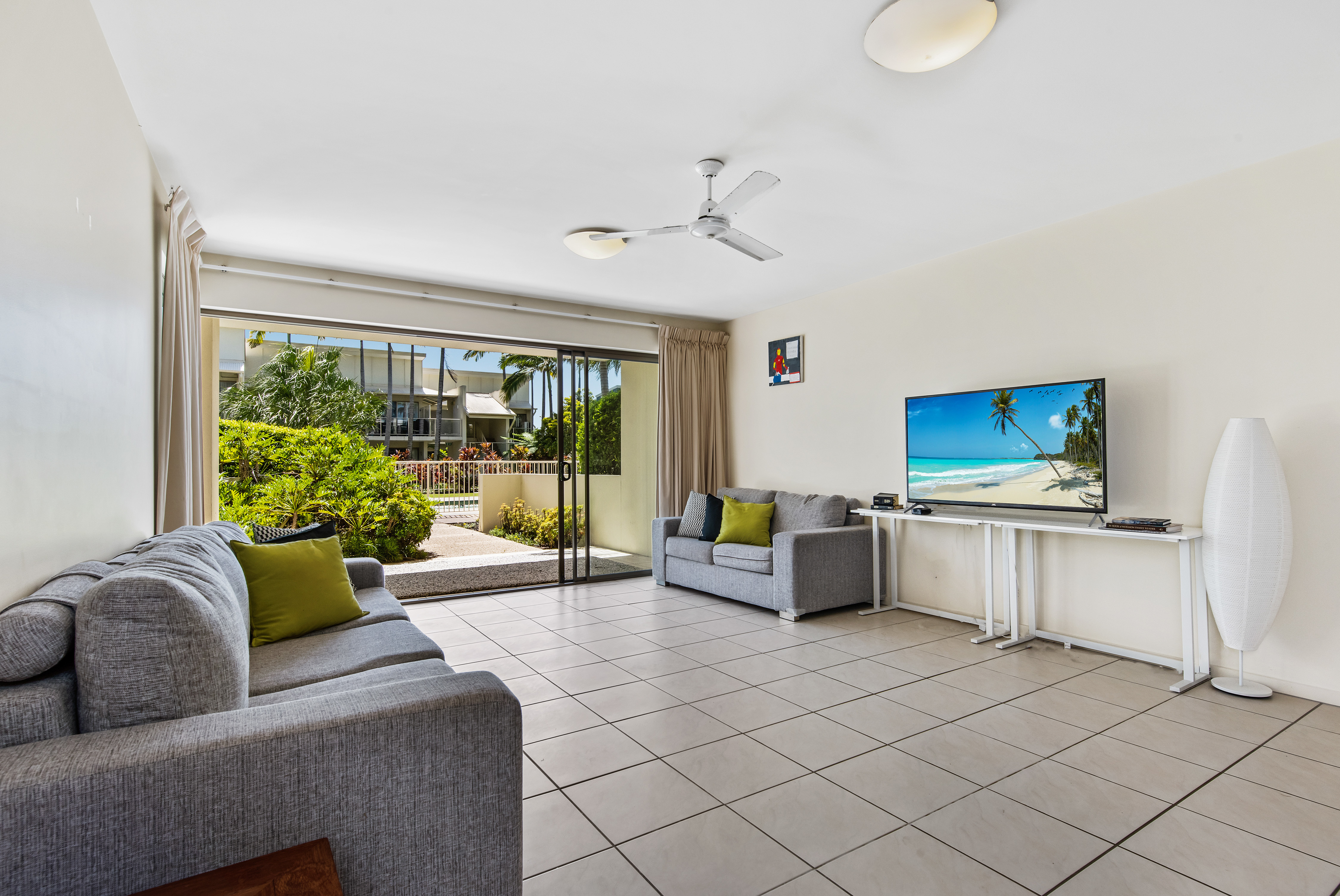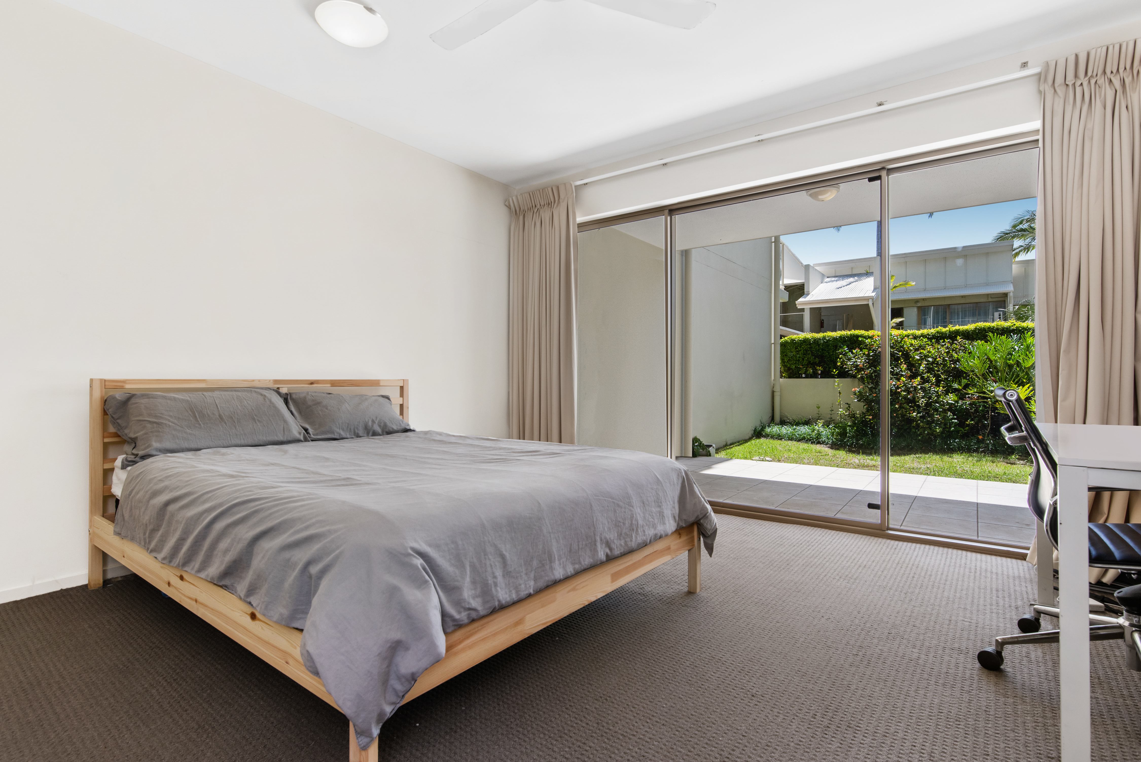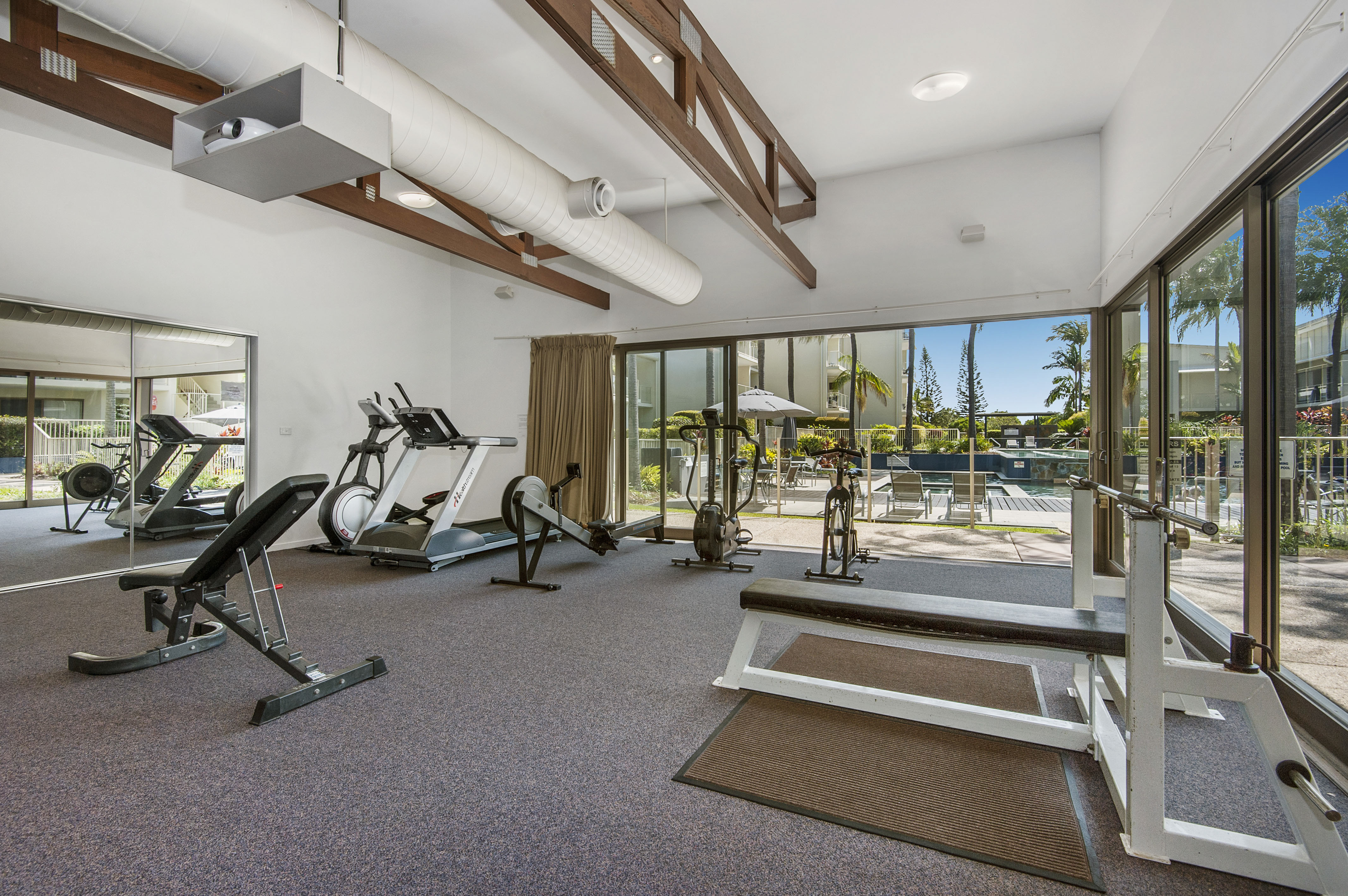 Leeward Apartment has house sized apartments and with the extra large terrace and exclusive courtyard adds to the overall feeling of space and freedom within the Unit.  The exclusive garden is north facing so enjoys the winter sun and is cool in summer offering extra space to relax and unwind.  It has fully ducted airconditioning but also has great cross ventilation throughout so you will very rarely feel hot and when you do the lap pool is just at your back door and is heated in winter if you enjoy a swim.  The complex offers other great facilities from Lagoon Pool, Spa Pool, Large Gymnasium with projector and music, full sized tennis court, sauna, toilet and shower facilities and a good size bike and watercraft storage shed.